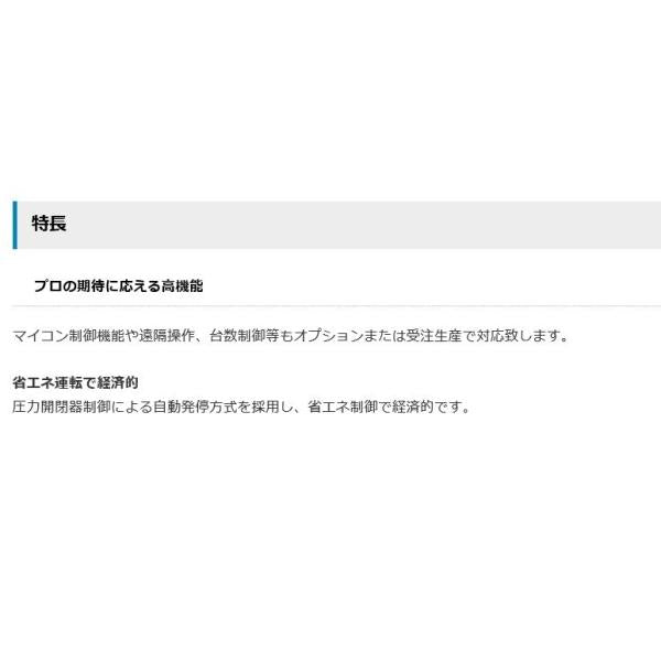 形 式: CLP75EF-8.5 M5 50hz*ドライヤーは、搭載されておりません。 定格出力: 7.5kW(10PS) 運転制御方式: 圧力開閉器 制御圧力 : 0.7〜0.85MPa 吐出空気量 :845 L/min 空気タンク容量: 70L 空気取出口 : Rc 3/4×1 ボールバルブ 外形寸法: 1230mm×870mm×1100mm(全幅×奥行×全高) 質 量 : 305kg 騒音値 : 55dB 電 圧 : 三相 200V ■ 特 長 ●シンプルで経済的。 ●パッケージタイプですので静音性に優れています。 ■写真は、イメージです。 ※※※ コンプレッサーのアフターサービスは全てお任せ下さい。※※※ ※納入・設置も御相談下さい。※ 運転制御の種類