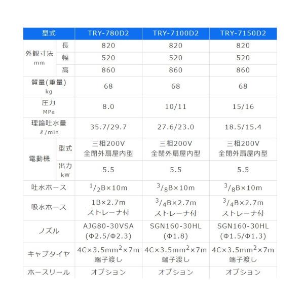 【有光 TRY-780D2 モータータイプ 200V 】 外観寸法 長×幅×高 mm :820×520×860 質量(重量) kg :69 圧力 Mpa :8.0 理論吐水量 l/min : 35.7/29.7 電動機 :三相200V 全閉外扇屋内型 / 5.5kw 吐水ホース / 吸水ホース :1/2B×10m / 1B×2.7m ストレーナ付 ノズル /キャブタイヤ : AJG80-30VSA (Φ2.5/Φ2.3)/ 4C×3.5mm2×7m 端子渡し ※吸水温度/MAX60℃ ■写真は、イメージです。 メーカーホームページはこちらから有光工業株式会社 重量物は法人様のみ車上渡し元払いになります。 個人様は、運送会社様の営業所止めになります。 ※仕様は予告なく変更になることがございます。 ※下記注意事項の確認をお願いいたします。